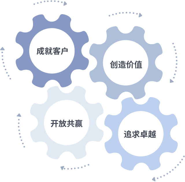 成就客户是一切决策的出发点,,创造价值是衡量所有工作的标准,,,追求卓越是我们做事做人的态度,,,开放共赢是我们的格局也是最终的结果。。。。价值观的齿轮环环相扣,,,,推动着组织里的每个人不断向前。。