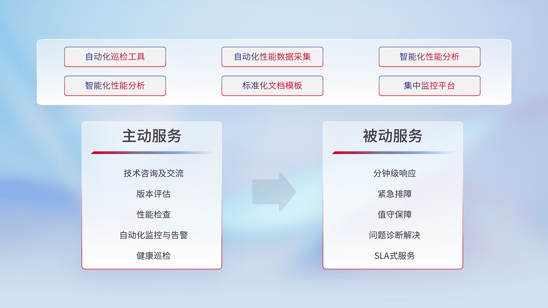 智能化工具和标准化文档,,保障服务质量,,,,提供主动服务(包含技术咨询、、、版本评估、、性能检查、、、自动化监控与告警、、健康巡检)和被动服务包含(分钟级响应、、紧急排障、、、、值守保障、、问题诊断解决、、、、SLA服务)。。